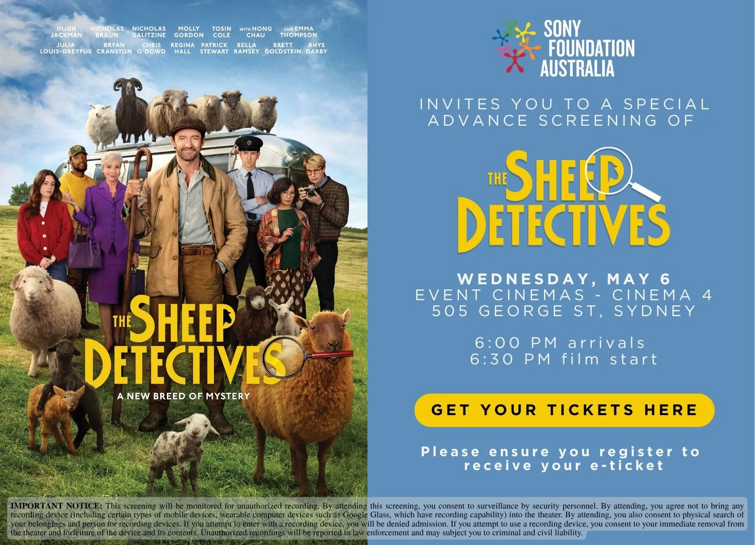Our pals at Sony Foundation and Sony Pictures Releasing are excited to extend an invite to you to join a special advance screening of THE SHEEP DETECTIVES, featuring Hugh Jackman, Nicholas Braun, Nicholas Galitzine, Molly Gordon, Hong Chau, Emma Thompson and more.